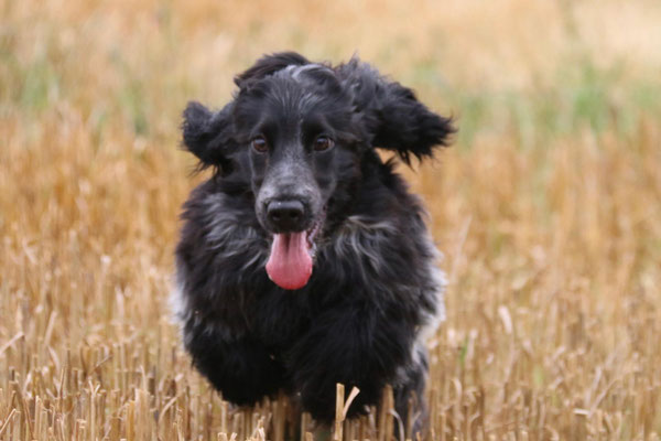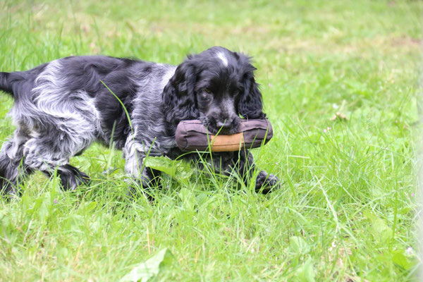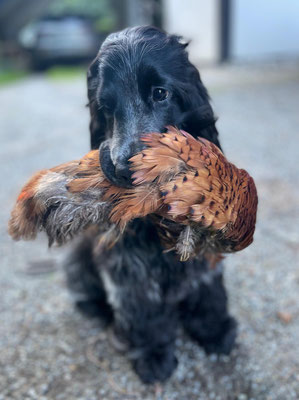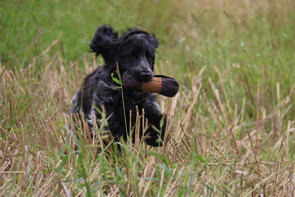 Ende August haben erstmal den Apport mit Federwild, in diesem Fall eine Krähe, probiert. Ich muss zugeben, ich hatte mir das etwas einfacher vorgestellt, aber nach einiger Zeit hat sie dann doch zunächst den Flügel und dann den ganzen Vogel gebracht. So ganz erschließt es sich ihr noch nicht, was das soll, aber ein Anfang ist gemacht. Danach war sie sehr müde.