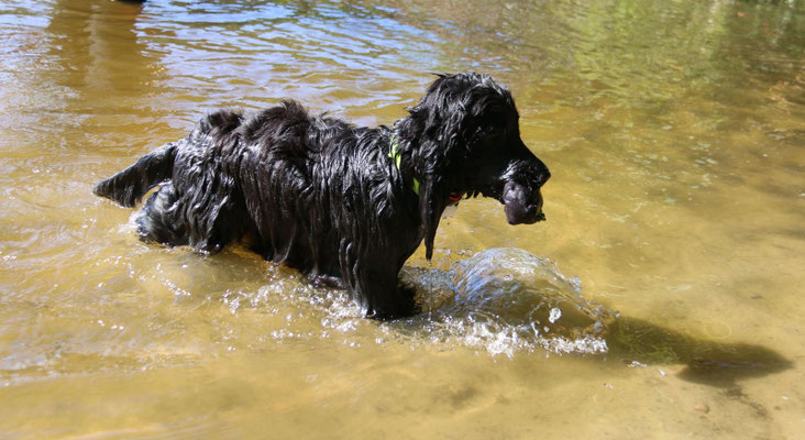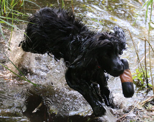 Dummytraining im Juli mit Sabrina und Ludwig. Elisa apportiert immer neue Gegenstände und wir haben das Kommando "rüber" neu geübt. Zusätzlich wurde auch noch Wassereis apportiert.